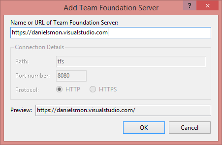 Figure 4 Add Team Foundation Server dialogue box, using the URL of my Visual Studio Online subscription