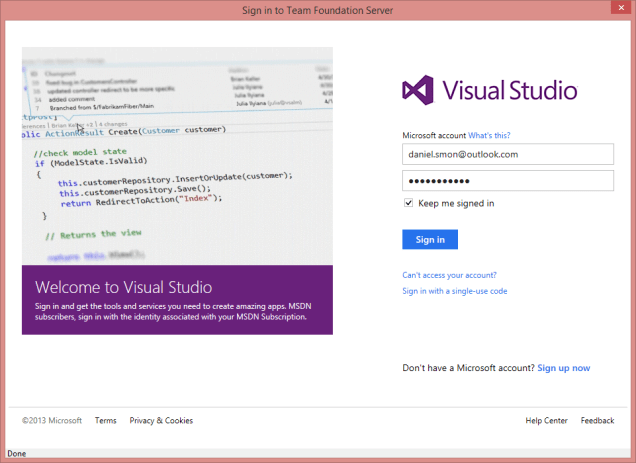 Figure 5 Dialogue box: Sign in to Team Foundation Server using Microsoft Account