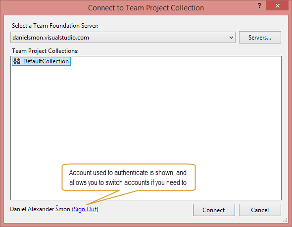 Once signed in, you can select your Team Project Collection and connect. You can connect to your DefaultCollection Team Project Collection. For those of you not already aware, you are currently limited to the DefaultCollection Team Project Collection in Visual Studio Online.