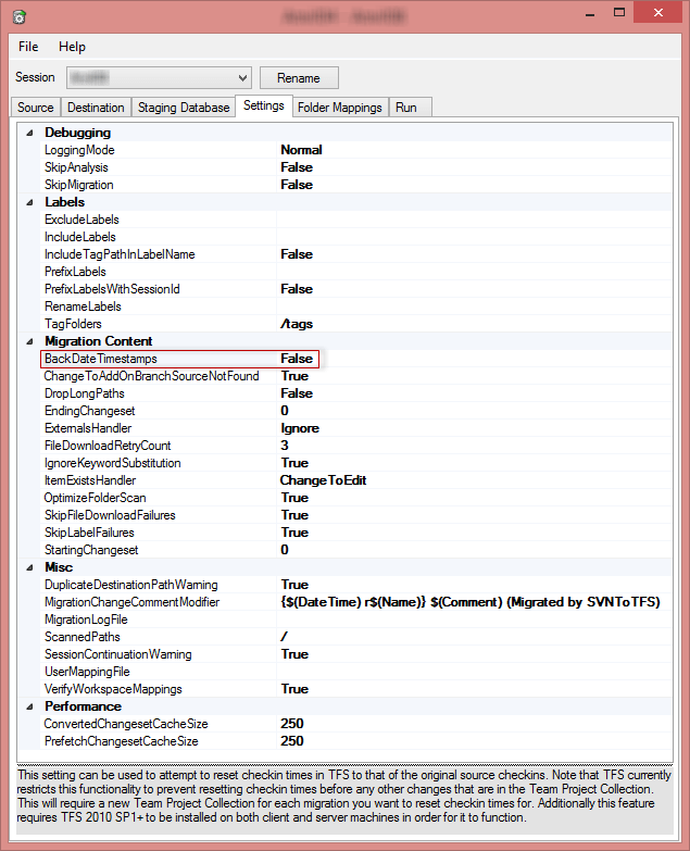 I won’t go through all of the settings in the tool, however it is worth touching on a few which we used. For example, by default the check-in comment of all migrated revisions from SVN is in the format {$(DateTime) r$(Name)} $(Comment) (Migrated by SVNToTFS). This can easily be changed in the settings tab.